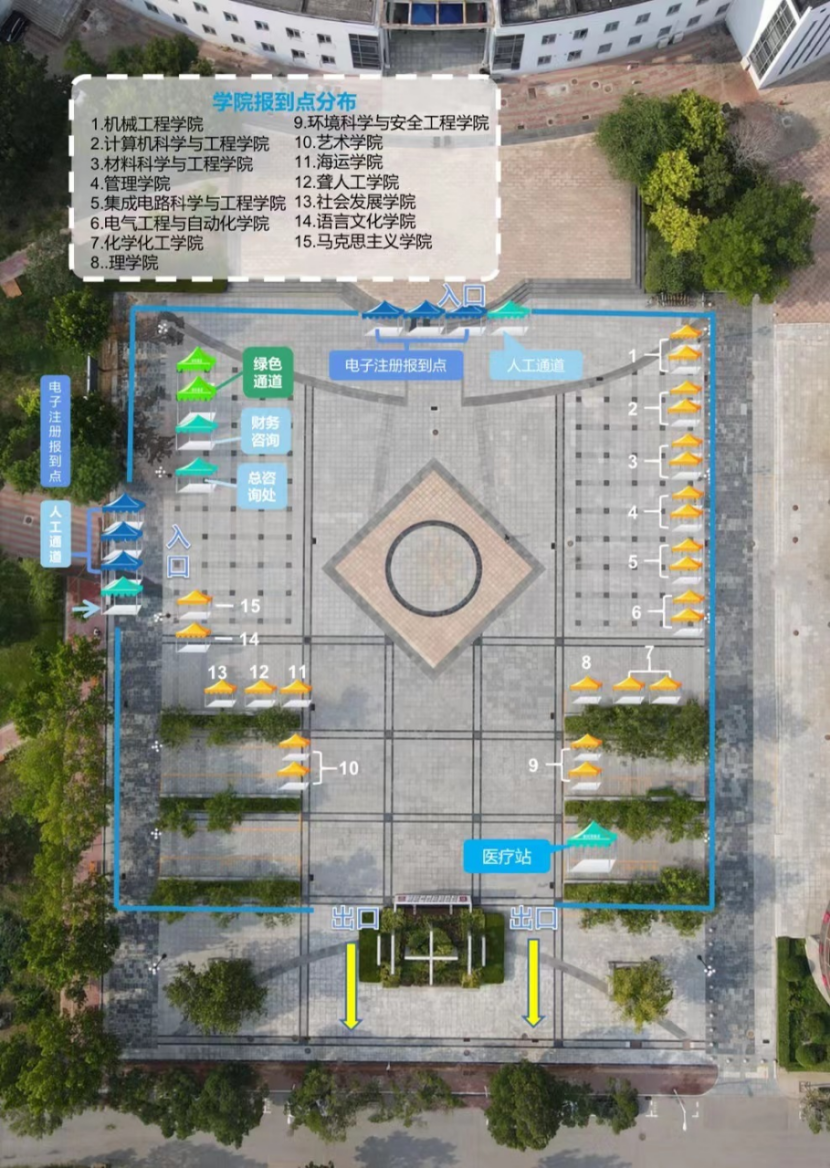 迎新报到地点设在朝阳广场,具体报到地点如图所示。