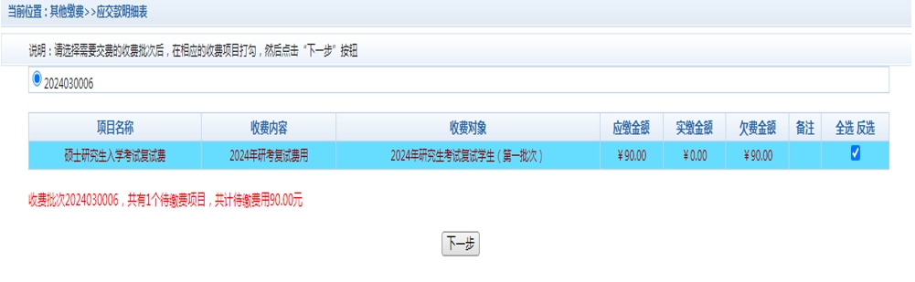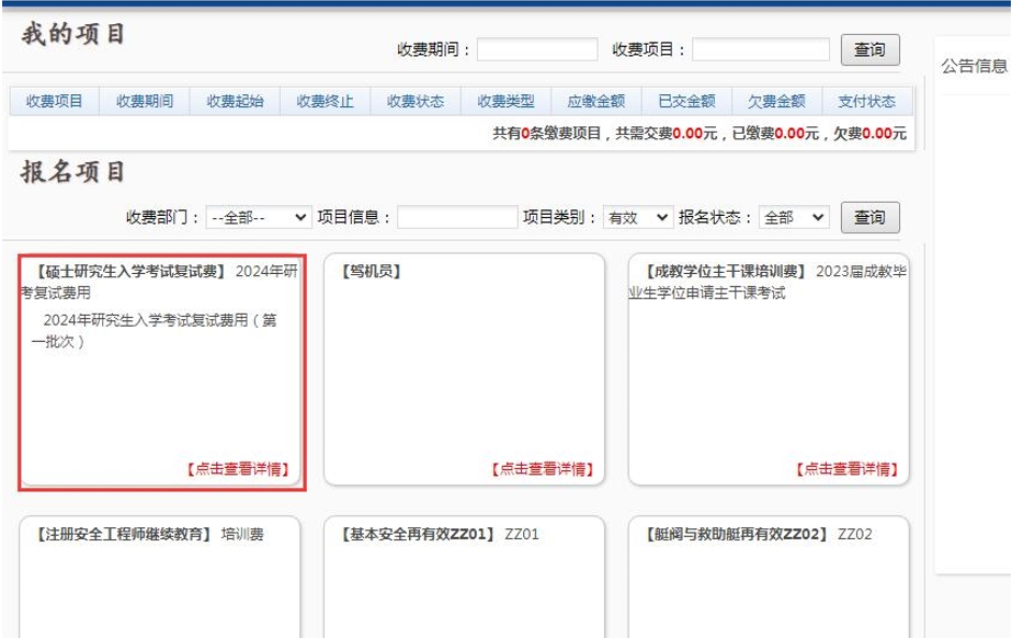 登录后首先点击“报名信息”-“报名”,选择“2024年研究生入学考试复试费用(第一批次)”进行报名。