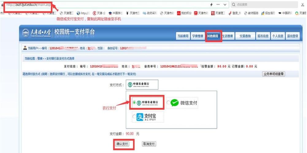 核对个人信息无误后,进行缴费。特别提示:目前PC端系统仅支持中国农业银行缴费方式,如需使用微信或支付宝方式缴费,复制此页面网址到手机,登录系统,点击“其它缴费”进行缴费!