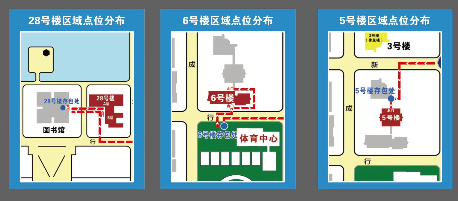 各考试楼考生物品存放处、休息室及考试所在楼宇分布位置见附图。
