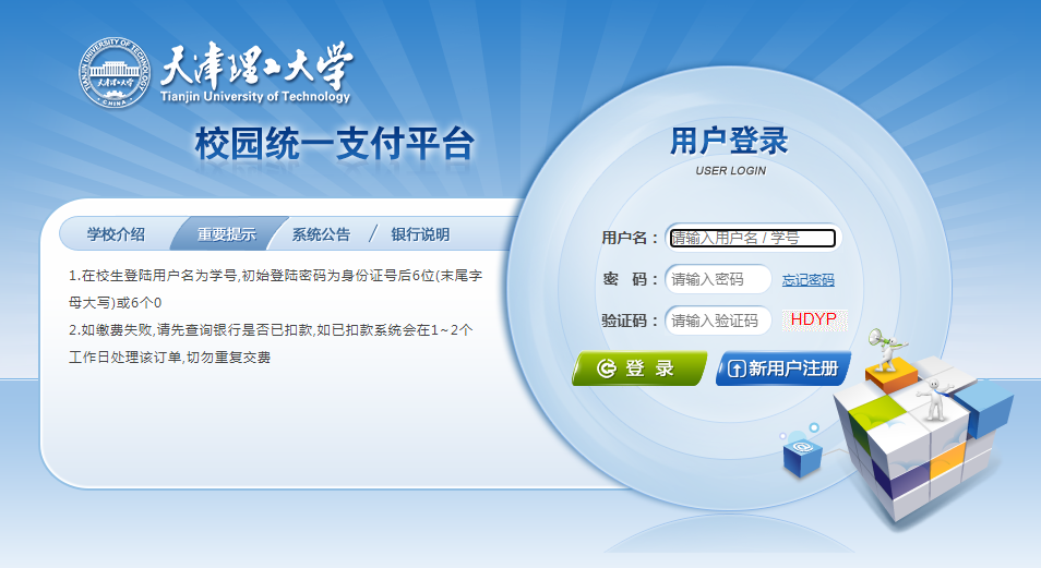 登录天津理工大学校园统一支付平台,网址:https://zxzf.tjut.edu.cn/。