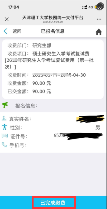 注:若考生无法登录或未查询到缴费信息,请稍后重试。若复试前仍无法缴费,请联系报考学院反馈。校外人员也可通过关注“天津理工大学财务处”公众号“校外缴费”界面进行报名缴费。