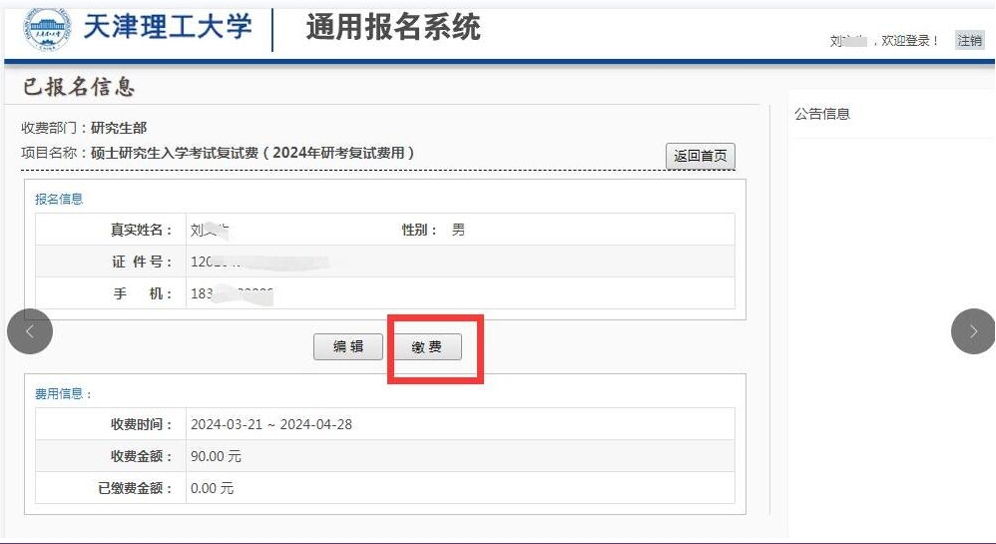 注:若考生无法登录或未查询到缴费信息,请稍后重试。若复试前仍无法缴费,请联系报考学院反馈。