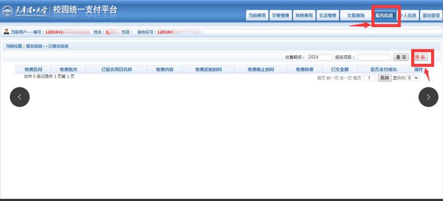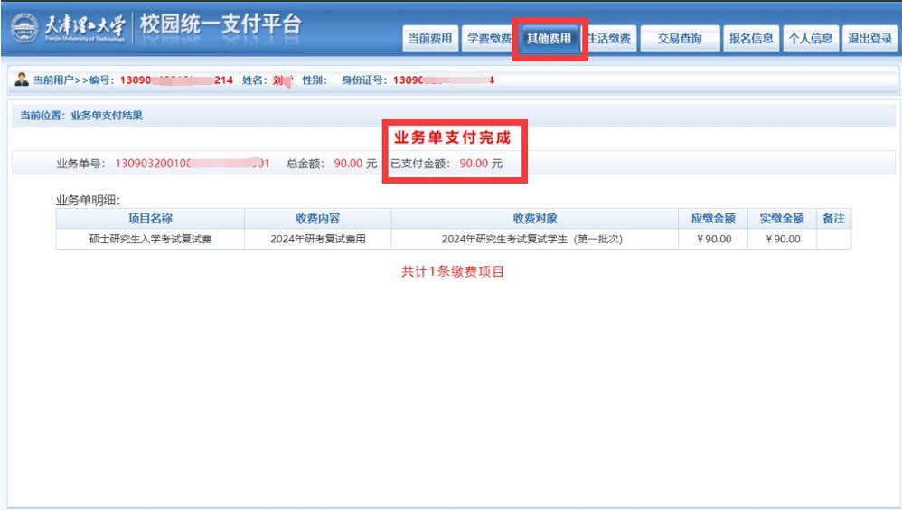 登录天津理工大学企业号-缴费大厅。缴费流程同上,缴费成功后保留截图(同上)。