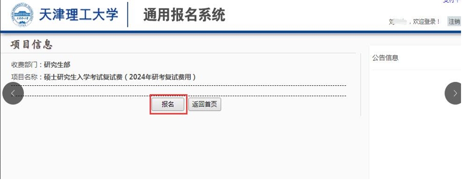 微信登录天津理工大学财务处公众号-功能菜单-登录(首次登录用户名为学号,密码为身份证号后六位)-统一支付-点击左上角“菜单”选项-报名系统-报名项目-选择“2024年研究生入学考试复试费用(第一批次)”进行报名。